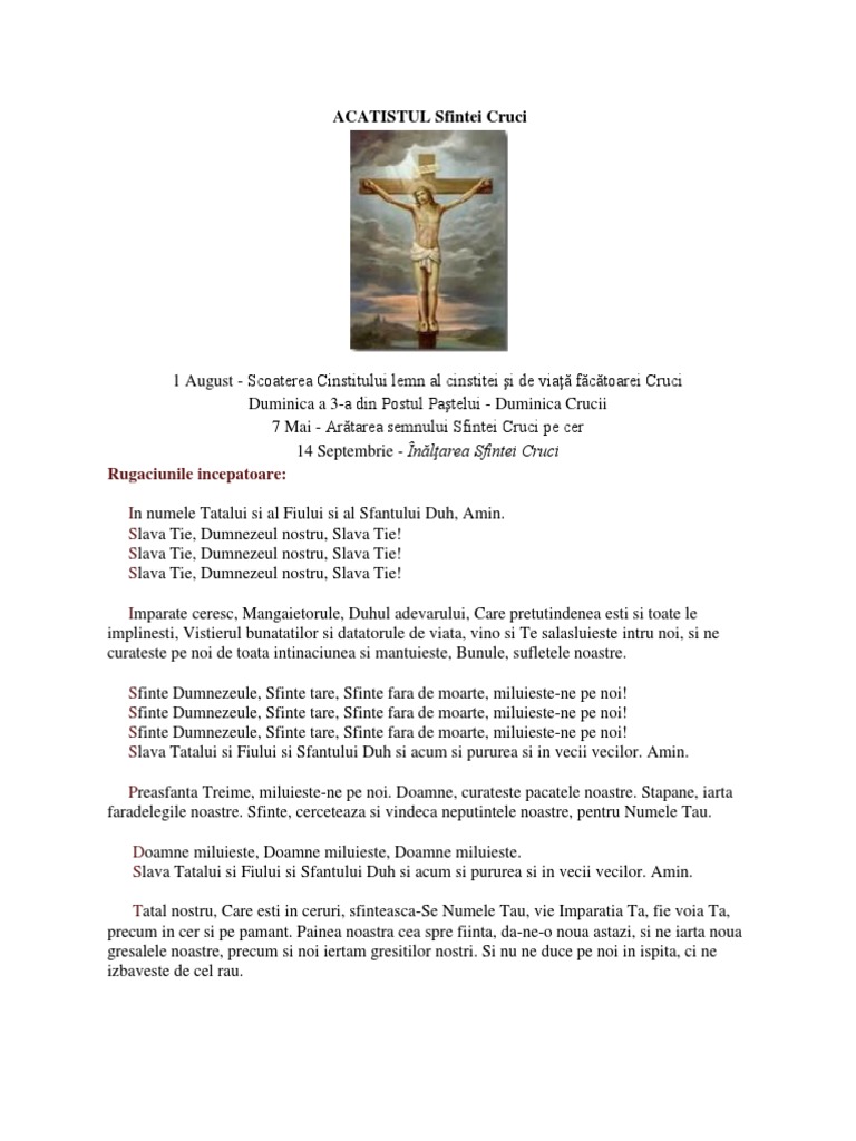 Veseleşte cu puterea Ta pe dreptcredincioşii creştini dăruindu-le biruinţă asupra celui protivnic. ACATISTUL SFINTEI CRUCI PDF. Înălţarea Sfintei Cruci prăznuită cu evlavie de creştini în fiecare an la data de 14 septembrie este cea mai veche sărbătoare consacrată cinstirii Crucii pe care a fost răstignit Iisus.